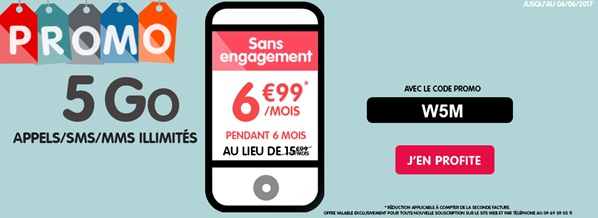 NRJ Mobile vous offre une remise de 9€ par mois pendant 6 mois sur son forfait Woot 5Go et ce jusqu'au 14 juin. Cet abonnement sans engagement est ainsi disponible à seulement 6.99€ par mois au lieu de 15.99€. Pour profiter de cette promotion, il suffit d'indiquer le code promo W5M lors de la souscription. Tout comme Auchan Telecom, ce MVNO appartenant au groupe Euro-Information Telecom vous permet de profiter de votre téléphone mobile partout en France, quelque soit votre situation. La carte SIM est facturée 5€ à la commande ou gratuite en cas d’achat concomitant d’un mobile.