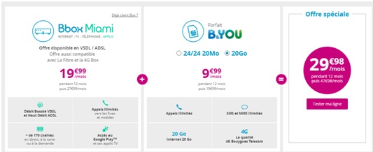 Bouygues Telecom vous propose une promo sur son forfait B&You 20Go dans le cadre d'une souscription à une offre BBOX. Vous pouvez en ce moment profiter de la BBOX Miami à partir de 14.99€ par mois au lieu de 27.99€ et d'un forfait avec 20Go à 9.99€ par mois au lieu de 19.99€ par mois. En cumulant les deux promos, votre pack box Fibre et mobile vous revient à 24.98€ par mois la première année puis 47.98€ hors coût de la location de la box à 3€ par mois. La bbox Miami est également en promo par ADSL ou VDSL à 19.99€ par mois soit avec le forfait 20Go à 29.98€ pendant 1 an puis 47.98€.