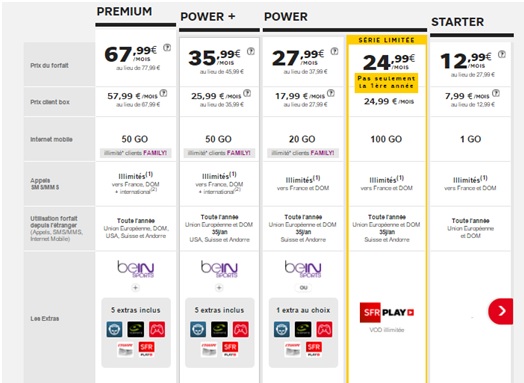 -Le forfait Starter Mini 2h + 100Mo est au tarif de 12.99€ avec engagement de 12 mois ou encore à 17.99€ sans engagement et sans mobile ou engagement de 24 mois et achat de Smartphone. Cet abonnement est ainsi disponible à partir de 7.99€ ou encore à partir de 2.99€ pour les abonnés SFR BOX. Ce forfait est offert dans le cadre d'une ouverture d'une ligne supplémentaire pour les clients SFR bénéficiant de l'avantage Family.