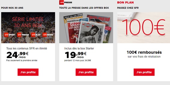 Les offres Internet Starter, Power et Premium de l'opérateur SFR sont actuellement en promo la première année. La formule BOX Starter est ainsi affichée au tarif de 19.99€ par mois hors coût de la location de la box à 3€ par mois. Pour réduire davantage le prix de votre abonnement internet maison, vous pouvez en passant par l'opérateur Low cost de SFR profiter de la RED BOX Fibre ou HD à 15€ par mois à VIE mais pas seulement la première année et sans aucun frais de location de box. Pour profiter d'un max de contenus, SFR commercialise depuis le mois de Mai une série limitée BOX à 24.99€ par mois sans condition de durée. Cette offre spéciale est valable jusqu'au 17 juillet prochain.
