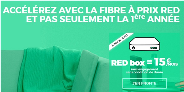 La RED BOX sans engagement et sans location de box est au prix de 15€ par mois à VIE sans la TV ou encore à 17€ par mois en ajoutant le service TV facturé 2€ par mois. Cette offre est disponible au même prix par ADSL, VDSL, THD ou Fibre (toutefois en zone non dégroupée, il faudra débourser 5€ de plus par mois). La RED BOX est disponible à 15€ par mois jusqu'au 10 juillet. Cet abonnement comprend un accès Internet jusqu’à 100 Mb/s ainsi que le téléphone illimité avec les appels gratuits vers les fixes en France et vers plus de 100 destinations. Pour la partie TV, l'opérateur propose une option TV sans engagement facturée tous les mois 2€ qui vous permet d'accéder à 26 chaînes ainsi que de nombreux bouquets en option. Le service SFR Presse est aussi inclus dans cette offre.