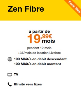 L’opérateur Orange vous propose son offre Zen Fibre en exclusivité web à 19.99€ par mois et ce pendant une période d’un an au lieu de 38.99€ par mois sans engagement grâce à une remise de 14€ par mois durant 12 mois ainsi qu’un remboursement 5€ par mois si vous changez d’opérateur internet avant le 22 août 2017. Les offres Livebox d’Orange sont disponibles sans engagement de durée et la location de la Livebox est facturée 3€ de plus par mois.