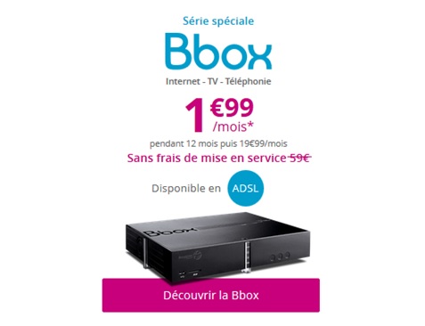 Après une prolongation exceptionnelle de quelques jours, la Série Spéciale Bbox à moins de 2€ par mois s’arrête ce soir à 23h59. Pour rentrer dans les détails, cette offre Bbox est disponible à 1.99€ par mois et ce pendant une période de 12 mois puis 19.99€ par mois la seconde année. Cet abonnement Box est soumis à un engagement de 24 mois et la location de la Box est facturée 3€ par mois. Pour info, en zone étendue, l’offre Bbox est facturée 8€ de plus par mois. Autre indication, les frais de mise en service habituellement facturés 59€ sont également offerts.