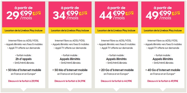 SOSH, la marque digitale de l’opérateur Orange commercialise des offres SOSH mobile + Livebox à partir de 29.99€ par mois. Ce type d’offre vous permet ainsi de profiter d’un seul forfait pour votre mobile et votre Internet à la maison. Vous recevez une seule facture chaque mois et profitez d’un service client unique. Autre avantage, les forfaits SOSH mobile + Livebox sont disponibles sans engagement et la location de la Livebox Play est incluse. Les frais de résiliation de l’accès Internet s’élèvent à 50€.