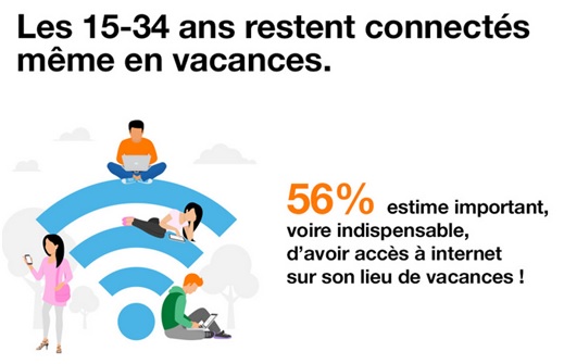 L’opérateur Orange a publié dernièrement une infographie représentant les usages des vacanciers en France avec leur téléphone. Et selon les chiffres de juin 2016 de TNS Sofres sur les usages numériques en vacances, la majorité des français restent connectés en vacances.