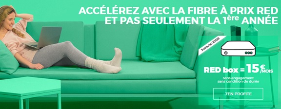 L’opérateur RED by SFR brade pendant quelques jours son offre RED BOX à 15€ au lieu de 19.99€ par mois. Vous avez en effet jusqu’au 21 Août à 23h59 pour profiter de la remise de 4.99€ par mois appliquée pendant toute la durée de votre contrat quelle que soit la technologie utilisée xDSL, THD ou Fibre (en zone non dégroupée, un supplément de 5€ par mois est exigé). La RED Box est sans engagement, vous êtes donc libre de résilier à tout moment (frais de résiliation de 49€). Les frais de mise en service sont facturés 49€, le matériel Box et décodeur ( avec l'option TV à 2€) sont fournis gratuitement. Bon à savoir ! L'opérateur RED BY SFR vous rembourse jusqu'à hauteur de 100€ vos frais de résiliation de votre ancien FAI.