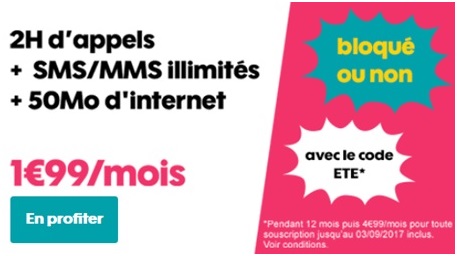 Jusqu’au 3 septembre prochain, vous pouvez chez SOSH bénéficier d'une remise mensuelle de 3€ pendant 1 an sur le plus petit forfait de l'opérateur. Grâce au code avantage ETE, le forfait SOSH 2h est disponible à seulement 1.99€ par mois au lieu de 4.99€ par mois. Ce forfait pas cher embarque 2H d’appels en France métropolitaine et depuis l’Europe ainsi que les SMS / MMS illimités en France métropolitaine et depuis l'Europe. Pour vos usages web, vous disposez avec cette offre de 50 Mo de data en France métropolitaine sur le réseau Orange (3G, 4G/4G+) et en Europe, de quoi consulter ponctuellement vos e-mails ou encore votre agenda en ligne (hors forfait facturé 0,05€/Mo). Ce forfait 2H existe également en version bloquée au même prix, idéal pour équiper un enfant d'un premier forfait mobile. Avec le forfait bloqué SOSH, vous n’avez aucun risque de dépassement de forfait. Une fois vos 2h d’appels épuisés, vous restez tout de même joignable et continuez à envoyer vos SMS et MMS en illimité. Bon à savoir, la promotion ETE n'est pas valable pour les clients Orange et Sosh.