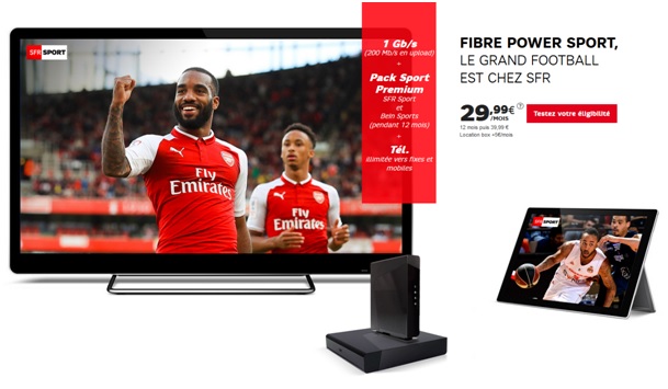 L’opérateur Internet SFR propose depuis fin août des nouvelles offres Box avec notamment l’abonnement Power Sport. Cet abonnement est disponible à 29.99€ par mois pendant 12 mois puis 39.99€ par mois. Cette offre Power Sport est soumise à un engagement de 12 mois et la location de la Box est facturée 5€ de plus par mois. Les frais d’accès au service sont facturés 49€.