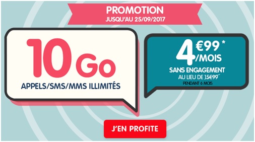 NRJ Mobile vous offre jusqu’au 25 septembre prochain une remise de 11€ par mois pendant une période de 6 mois sur son forfait Woot 10Go soit ce dernier à 4.99€ par mois au lieu de 15.99€. Pour profiter de cette remise mensuelle, il vous suffit d’indiquer le code promo W10G lors de votre souscription. Cette remise est applicable à compter de la seconde facture.