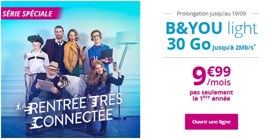 Chez Bouygues Telecom, vous avez jusqu’au 19 septembre inclus pour souscrire à une Série Spéciale B&YOU Light 30Go à 9.99€ par mois sans condition de durée et sans engagement. Ce forfait B&YOU comprend les appels, SMS et MMS illimités en France métropolitaine. Vous disposez aussi d’une enveloppe Internet mobile de 30Go par mois avec des débits internet descendant et ascendant jusqu'à 2Mb/s (maximum théoriques).