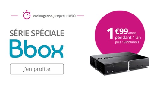 Bonne nouvelle, l’opérateur Bouygues Telecom vient à nouveau de prolonger de quelques jours son offre spéciale Bbox à prix réduit. Celle-ci est désormais disponible jusqu’au 18 septembre inclus. Rappelons que cette offre Bbox est proposée à 1.99€ par mois pendant une période de 12 mois (+3€/mois location Box). Autre information, cet abonnement Bouygues Telecom est soumis à un engagement de 24 mois. La seconde année, l’offre Bbox est facturée 19.99€ par mois (+3€/mois location Box). Et dans le cadre de cette offre promotionnelle, l’opérateur Bouygues Telecom vous offre également les frais de mise en service habituellement facturés 59€.