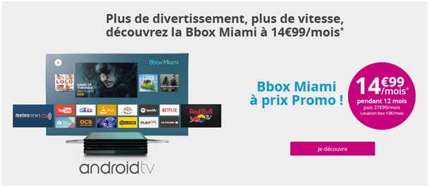 L’opérateur Bouygues Telecom vous propose également en ce moment son offre Bbox Miami à prix promo à savoir 14.99€ par mois pendant une période de 12 mois au lieu de 27.99€ par mois. Cette offre Bbox Miami est soumise à un engagement de 12 mois et location de la box est facturée 3€ de plus par mois.