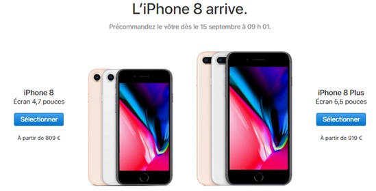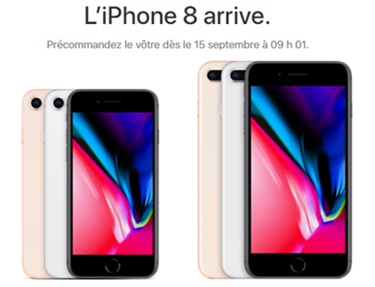 Ces tarifs sont valables pour l'achat d'un iPhone nu via le site en ligne Apple à compter du 15 septembre ou 27 octobre selon le modèle choisi. Ces nouveaux modèles iPhone 8 et iPhone 8 Plus sont disponibles en précommande chez les opérateurs mobiles SFR, Orange, Bouygues Telecom et Free Mobile ce vendredi 15 septembre.