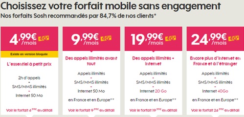 Pour les plus petits consommateurs d'internet sur mobile, vous pouvez opter pour le forfait SOSH à 9.99€ par mois. Cette offre comprend les appels, SMS et MMS illimités en France métropolitaine et depuis l'Europe ainsi qu’Internet mobile avec 50 Mo de data en France métropolitaine sur le réseau Orange (3G, 4G/4G+) et en Europe (hors forfait facturé 0,05€/Mo). Et pour les moins bavards, SOSH commercialise une formule 2H à 4.99€ par mois. Ce forfait pas cher embarque 2H d’appels en France métropolitaine et depuis l’Europe ainsi que les SMS / MMS illimités en France métropolitaine et depuis l'Europe. Pour vos usages web, vous disposez avec cette offre de 50 Mo de data en France métropolitaine sur le réseau Orange (3G, 4G/4G+) et en Europe, de quoi consulter ponctuellement vos e-mails ou encore votre agenda en ligne (hors forfait facturé 0,05€/Mo). Ce forfait 2H existe également en version bloquée au même prix.
