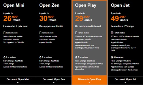 La formule du moment chez l’opérateur est l’offre Open Play proposée à seulement 29.99€ par mois la première année au lieu de 64.99€ par mois jusqu’au 04 octobre. Cette formule comprend un accès Internet ADSL ou Fibre selon votre zone géographique ainsi que les appels illimités vers les fixes et les mobiles en France et vers les fixes de plus de 110 destinations depuis le poste branché à la box ainsi que la TV d’Orange avec un bouquet gratuit de 160 chaînes. Le forfait mobile inclus avec cet abonnement embarque une enveloppe de 30Go par mois sur le réseau numéro 1 en France ainsi que les appels, SMS et MMS illimités en France et depuis l’Europe et les DOM.