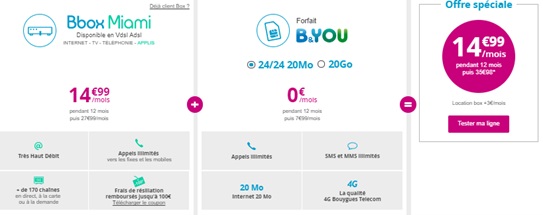 En optant pour un pack BOX et Mobile chez l’opérateur, vous pouvez profiter d’une BOX Fibre, xDSL ou ADSL à partir de 14.99€ par mois, la première année puis 27.99€ avec un forfait B&You avec une enveloppe Web de 20Mo ainsi que les appels et SMS et MMS illimités à 0€ par mois la première année puis 7.99€. Ce pack vous revient ainsi à 14.99€ pendant 1 an puis 35.98€ par mois. Autre formule possible, la BBOX Miami avec le forfait B&You 20Go à 9.99€ par mois la première année puis 19.99€. Le forfait mobile associé comprend les appels, SMS et MMS illimités ainsi qu’une enveloppe Internet mobile de 20Go par mois sur le grand réseau Bouygues Telecom. Pour profiter de ces offres spéciales, vous devez souscrire à l’offre Bbox puis souscrire au forfait B&YOU. Vous devez ensuite remplir et renvoyer le coupon à Bouygues Telecom. Vous recevrez alors le remboursement sous forme de remise sur facture d’un montant de 7.99€ ou 10€ par mois pendant un 12 mois selon le forfait choisi (offre limitée à deux lignes B&YOU par box).