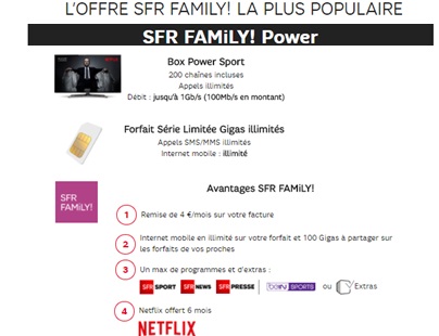 L’offre SFR Family, la plus populaire du moment se compose d’une BOX Power Sport ainsi qu’un forfait mobile avec des Gigas illimités. Cette offre vous permet de profiter de tous les avantages SFR Family avec une remise de 4€ par mois ainsi qu’un accès Internet mobile en illimité sur votre forfait et 100 Gigas à partager sur les forfaits de vos proches et un max de programmes tels que SFR Sports, SFR News, SFR Presse et beIN Sports ou les extras . Vous pouvez également profiter du service Netflix offert pendant 6 mois. Ce pack est disponible à 60.98€ par mois la première année puis 79.98€ hors coût de la location de la BOX à 5€ par mois.