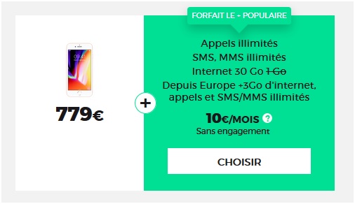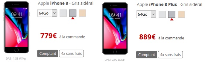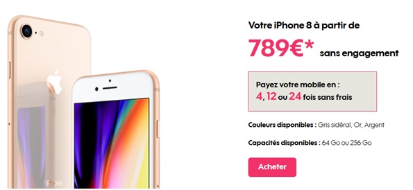Avec un forfait sans engagement, l’opérateur RED by SFR vous propose l’iPhone 8 à 779€ en version 64Go. L’iPhone 8 256 Go est disponible à 949€, l’iPhone 8 Plus 64Go à 889€ et l’iPhone 8 Plus 256 Go à 1059€.
