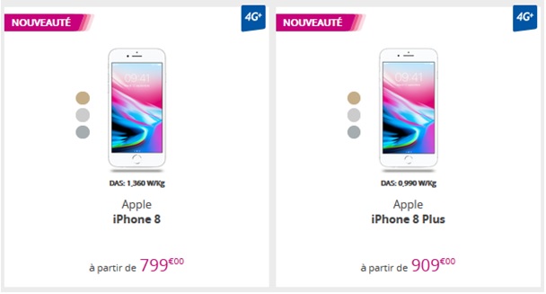 Avec la marque digitale SOSH, vous pouvez commander l’iPhone 8 en version 64Go à 789€ avec un forfait sans engagement. Vous pouvez payer votre mobile en 4, 12 ou 24 fois sans frais. L’iPhone 8 256Go est quant à lui disponible au prix de 949€, l’iPhone 8 Plus 64Go à 899€ et enfin l’iPhone 8 Plus 256 Go à 1059€.