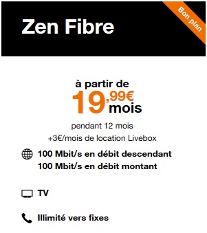 L’offre Zen Fibre regroupe un accès Internet avec la Fibre (100 Mb/s), la TV d’Orange avec 160 chaînes (multi TV offert sur demande), le téléphone avec les appels illimités vers les fixes de France métropolitaine, des DOM et plus de 100 destinations internationales. Vous profitez également de 10 heures d’appels par mois offerts sur demande vers les fixes d'Algérie + Tunisie offert sur demande. De plus, les appels sont illimités vers les mobiles des USA et du Canada. Avec l’offre Zen Fibre d’Orange, vous disposez aussi de l’installation à domicile, du stockage en ligne 10Go avec le Cloud d’Orange, le service 24h garanti (solution dans les 24H en cas de panne) ainsi que Cinéday (1 place de cinéma offerte pour 1 achetée tous les mardis).