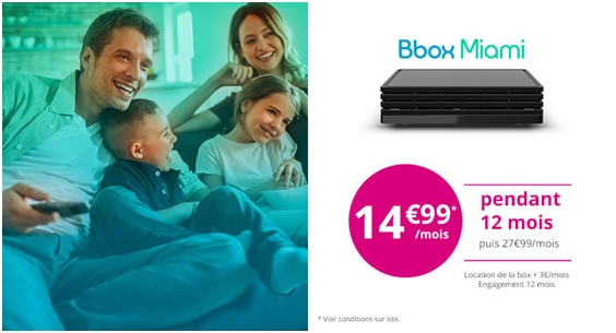 L’opérateur Bouygues Telecom vous propose jusqu’au 12 novembre prochain son offre Bbox Miami à prix réduit. Plus précisément, cette offre Bbox est disponible à 14.99€ par mois pendant 12 mois (+3€/mois location de la box) au lieu de 27.99€ par mois. Cette offre est soumise à un engagement de 12 mois. Les frais de mise en service s’élèvent à 59€.