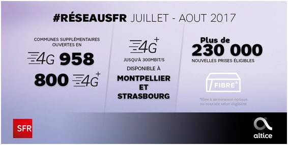 Dans un communiqué de presse publié hier, l’opérateur SFR dresse un bilan de ses déploiements Très Haut Débit (Fixe et Mobile) pour la période de Juillet et Août. Au cours de cette période estivale, l’opérateur a continué l’extension de son réseau 4G et 4G+ avec 958 communes qui ont bénéficié de l’arrivée de la 4G et 800 de la 4G+. Ce dernier en profite également pour rappeler que selon l’ANFR (Agence Nationale des Fréquences), SFR est l’opérateur disposant de plus grand nombre d’antennes 4G en service en France avec 24 067 antennes.