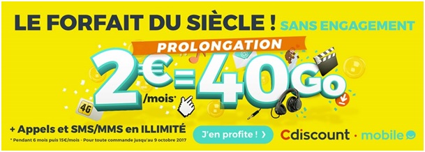 L’opérateur Cdiscount Mobile vous offre quelques jours supplémentaires pour profiter de son forfait à prix cassé. En effet, jusqu’au 9 octobre à 17h59, cet opérateur vous offre une remise de 13€ par mois pendant une période de 6 mois sur son forfait 40Go soit cet abonnement à seulement 2€ par mois au lieu de 15€. Autre information, la carte SIM est facturée 5€ à la commande.