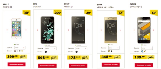 L'opérateur SFR propose aussi des remises temporaires exceptionnelles pour l'achat d'un Smartphone sans abonnement. Et en ce moment, vous pouvez obtenir l'iPhone SE 128Go à 400€ au lieu de 460€ sans forfait chez SFR ou encore le Sony Xperia XA1 Ultra à 348.99€ au lieu de 398.99€. Le Sony Xperia L1 bénéficie d'une remise immédiate de 20€ soit à 178.99€ au lieu de 198.99€. Autre bon plan, le HTC U Ultra est affiché à 598.99€ au lieu de 798.99€ grâce à la remise immédiate de 200€. Et enfin, le Starxtrem 6 d'Altice est proposé à 139.99€ au lieu de 179.99€. Ces réductions sont valables pendant encore 2 jours. En optant pour cette solution, vous pouvez conserver votre forfait actuel et le mobile est utilisable avec une puce d'un autre opérateur. En effet, les portables vendus sans forfait chez SFR sont débloqués ou desimlockables gratuitement.