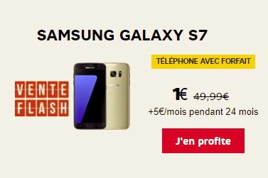 L'opérateur SFR vous propose une vente flash pour l'achat d'un Samsung Galaxy S7. Ce modèle est affiché à 1€ puis 5€ par mois pour toute souscription à la série limitée 100Go facturée 34.99€ par mois et soumise à un engagement de 24 mois. L'opérateur vous offre une remise immédiate de 38.99€ ainsi qu'un remboursement de 50€ sur demande pour l'achat de ce Samsung. Vous pouvez aussi payer ce Smartphone au comptant avec un versement de 181€ à la commande soit 121€ après le remboursement différé de 50€.