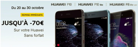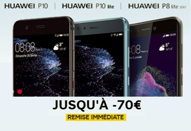 Vous cherchez à vous équiper d'un Huawei P10, P10 Lite ou encore d'un Huawei P8 Lite 2017 ? Profitez de l'opération proposée par SFR pour économiser sur votre nouveau Smartphone Huawei. Entre le 20 et 30 octobre, l'opérateur vous offre jusqu'à 70€ de remise immédiate pour l'achat d'un modèle du constructeur chinois sans abonnement et sans engagement. Vous pouvez ainsi obtenir :