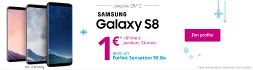 L'opérateur Bouygues Telecom met en avant le Galaxy S8 avec la souscription à un forfait Sensation 50Go avec engagement de 24 mois. Ce modèle star de l'année 2017 est en effet affiché à 1€ avec le paiement en 24 fois sans frais (+8€ par mois pendant 24 mois). Pour profiter de ce prix canon, vous devez ouvrir une nouvelle ligne chez Bouygues Telecom avec conservation du numéro de téléphone et opter pour un règlement en 24 fois sans frais. L'opérateur offre en effet une remise de 180€ dans le cadre d'une souscription à un forfait Sensation 20Go et plus et portabilité de numéro quel que soit le mobile acheté. Autre promo, si vous revendez votre ancien mobile, ce dernier vous offre un bonus reprise de 100€.
