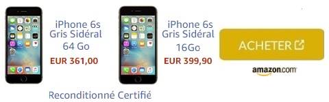 -Amazon quant à lui vous permet de réduire davantage le prix de l'iPhone 6S en optant pour un modèle reconditionné. Les tarifs démarrent ainsi à partir de 312€ pour la version 16Go ou encore à partir de 361€ pour la version 64Go. L'iPhone 6s 16Go remis à neuf est affiché à partir de 529€ chez Fnac. La livraison est gratuite.