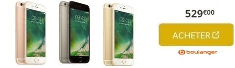 -Boulanger vous propose l'iPhone 6s en version 32Go en or, or rose ou gris sidéral à partir de 529€ au lieu de 629€. La livraison en magasin Boulanger ou encore en point relais est gratuite avec ce marchand. Pour le paiement, vous pouvez payer votre nouveau Smartphone en 4 fois.