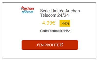Il vous reste quelques jours seulement pour profiter chez Auchan Telecom du code promo MOINS4. Ce code avantage vous permet d’obtenir une réduction de 4€ par mois à VIE sur le forfait illimité proposé par cet opérateur. Ainsi, cet abonnement mobile vous revient à 4.99€ par mois sans condition de durée au lieu de 8.99€ par mois (forfait sans engagement). Pour info, cette Série Limitée est réservée aux particuliers pour toute nouvelle souscription. Autre condition, la réduction est applicable à compter de la seconde facture.