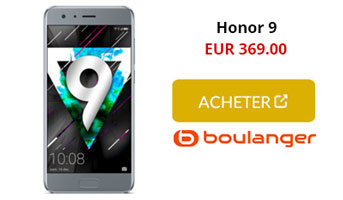 Pour la partie photo, le Honor 9 embarque un double capteur photo dorsal signé Leica. Le premier objectif RGB profite 12 mégapixels tandis que le second arbore un objectif monochrome de 20 mégapixels. Ces deux capteurs ouvrent à f/2.2 et sont accompagnés d’un autofocus à détection de phase et d'un flash dual-tone. De plus, ce double objectif permet de filmer en 2160p à 30 images par seconde. A l’avant, le capteur frontal de 8 mégapixels ouvre à f/2.0. Notez que ce téléphone chinois est animé par Android 7.0 Nougat et est pourvu d’un lecteur d’empreintes digitales situé sous l’écran. Grâce au site marchand Boulanger vous pouvez dès à présent vous procurer le Honor 9 à 369 euros au lieu de 429 euros. Il est disponible en différents coloris silver, noir et bleu, la livraison est offerte et il est expédié sous 24 heures. Par ailleurs, notez également que la reprise de l’ancien appareil est incluse et que vous avez 15 jours pour changer d’avis.