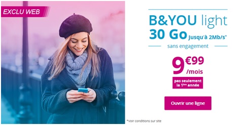 Vous avez jusqu’au 19 février inclus pour passer chez l’opérateur Bouygues Telecom et ainsi bénéficier du forfait B&YOU Light 30Go disponible en Série Spéciale à 9.99€ par mois. Ce prix promotionnel est valable sans condition de durée c'est-à-dire pendant toute l’utilisation du service. Autre information importante, il s’agit d’un forfait sans engagement, vous pouvez donc quitter cet opérateur à tout moment et ce sans frais. Cette Série Spéciale Bouygues Telecom est valable pour l’ouverture d’une nouvelle ligne et limitée à une offre par foyer. Autre information, la carte SIM pour profiter de cette offre Bouygues Telecom est facturée 10€ à la commande.