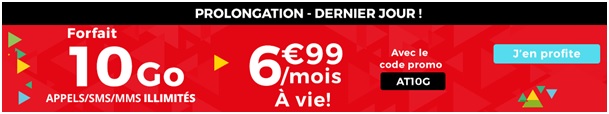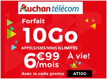 Bonne nouvelle, l’opérateur mobile Auchan Telecom vient de prolonger son offre promotionnelle avec un forfait 10Go à seulement 6.99€ par mois (au lieu de 16.99€/mois) sans engagement mais aussi sans condition de durée (prix valable à vie). Pour bénéficier de ce prix mini, il vous suffit d’indiquer le code avantage AT10G lors de votre inscription. Cette offre promotionnelle est réservée aux particuliers pour toute nouvelle souscription. Autre condition, la remise de 10€ est applicable à compter de la seconde facture.