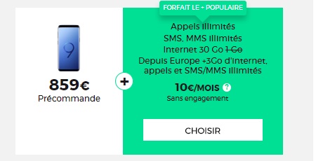 -Avec un forfait Bouygues Telecom, le galaxy S9 est affiché au prix de 179.90€ puis 8€ par mois pendant 24 mois avec un forfait Sensation 50Go à 41.99€ par mois. Acheter le Galaxy S9 chez Bouygues Telecom
