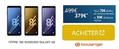 Vous avez jusqu'au 04 mars pour profiter de l'opération spéciale Galaxy A8 2018 chez Boulanger avec un bonus de 50€ dans le cadre de la reprise de votre ancien mobile ainsi que la possibilité de le payer en 10 fois sans frais. Le bonus de 50€ est cumulable avec l'offre de remboursement de 70€ proposée par Samsung jusqu'au 31 mars prochain. Le Galaxy A8 2018 est ainsi disponible à partir de 379€ au lieu de 499€ chez ce marchand. Et pour les plus petits budgets, Boulanger permet de payer ce nouveau Samsung à 49.90€ à la commande puis 9 fois ce même montant avec le paiement 10 fois sans frais.