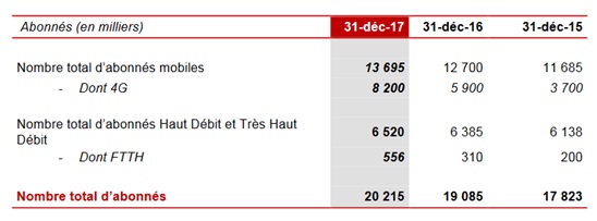 Free Mobile a également poursuivi en 2017 l’amélioration du mix d’abonnés avec pour la première fois depuis le lancement une majorité d’abonnés sur le forfait Free illimité à 19.99€ par mois. Autre information, au 31 décembre 2017, cet opérateur comptabilise 8.2 millions de clients 4G soit une augmentation de 2.3 millions d’abonnés en 12 mois. Les usages ont aussi fortement augmenté sur l’année 2017 avec 8.4Go par mois en moyenne par abonné mobile. En ce qui concerne le déploiement du réseau mobile Free, ce dernier revendique au 31 décembre 2017 un taux de couverture 4G de 86% de la population française et 94% en 3G. Cet opérateur souhaite atteindre une couverture 4G de 90% fin 2018 et de 95% en 3G.