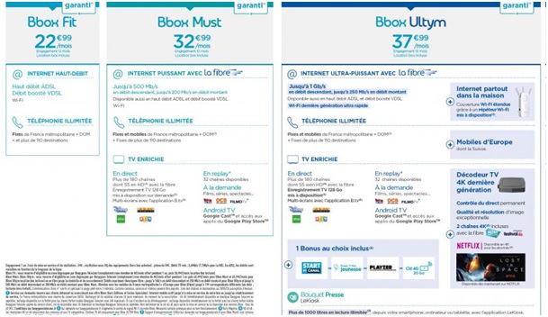 En plus de cette promesse « d'Internet Garanti », l’opérateur Bouygues Telecom a annoncé aujourd’hui le lancement d’une nouvelle gamme d’offres Bbox dès le lundi 23 avril : Bbox Fit, Bbox Must et Bbox Ultym. Avec la formule Bbox Ultym, les clients Bouygues Telecom profiteront de la puissance de la Fibre et de la TV en 4K. Cet abonnement Bbox Ultym sera affiché à 22.99€ par mois pendant un an puis 37.99€ avec la location de la Box incluse. Cette offre sera aussi accessible en Haut Débit ADSL ou débit boosté VDSL. Pour résumer, cet abonnement internet intègrera un accès jusqu’à 1Gb/s, un Wifi dernière génération ainsi qu’un répéteur Wifi (sur demande). Vous disposerez aussi avec cette offre d’un décodeur nouvelle génération 4K Android pour une expérience TV plus rapide. Plus précisément, avec ce décodeur, vous profiterez de l’enregistrement inclus, du contrôle du direct, plus de 180 chaînes TV dont 55 en HD et 2 chaînes en 4K avec la Fibre. La Bbox Ultym vous permettra aussi d’accéder à des contenus de qualité avec au choix Start by Canal (avec Canal Play et Fox Play), le bouquet TV Bbox Jeunesse ou Playzer. Autre service, Bouygues Telecom mettra à votre disposition une clé 4G avec 20Go de data pour bénéficier d’une connexion Internet en mobilité partout en France ainsi que le bouquet Presse avec LeKiosK. Et enfin, en ce qui concerne la partie téléphonie, la Bbox Ultym vous permettra d’appeler en illimité vers les fixes et les mobiles de France, des DOM et Europe ainsi que vers les fixes de 110 pays.
