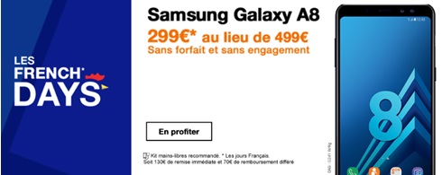 -Orange quant à lui vous permet d'acquérir le Galaxy A8 2018 à 299€ après la remise différée de 70€ proposée par Samsung. Dans le cadre du French Days, l'opérateur historique vous permet d'obtenir un rabais immédiat de 130€ à la commande, le Galaxy A8 2018 est ainsi facturé 369€ à la commande. Ce bon plan proposé par Orange est valable sans abonnement. Vous pouvez également profiter de cette ristourne en optant pour un forfait SOSH à sans engagement à partir de 4.99€ par mois.