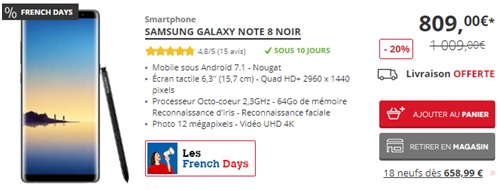 Darty est encore plus généreux pour l'achat d'un Galaxy Note 8. Ce marchand vous offre en effet une remise automatique à la commande de 200€ sur ce modèle. Grâce au rabais, le Note 8 est affiché au prix de 809€ au lieu de 1009€.