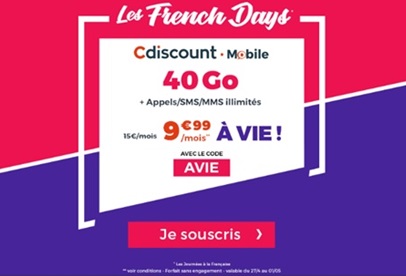 Cdiscount Mobile vous permet également de vous équiper d'un forfait avec 40Go de data à moins de 10€ par mois. En effet, à l'occasion du French Days, ce MVNO propose une série spéciale avec 40Go de data à 9.99€ par mois et pas seulement la première année. Ce forfait sans engagement avec une enveloppe Web de 40Go par mois est au prix fixe de 9.99€ par mois au lieu de 15€ par mois jusqu'au 01 mai inclus. Cette offre se compose des appels, SMS et MMS illimités, un volume de 40Go par mois en France et 5Go depuis l’Europe pour vos usages internet sur mobile. La carte SIM est facturée 5€.