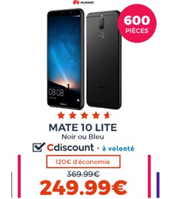 Cdiscount met en avant jusqu'au 01 mai inclus plusieurs produits high tech à l'occasion du French Days. Pour les petits budgets, ce marchand offre une remise exceptionnelle pour l'achat d'un Huawei Mate 10 Lite. Ce modèle du constructeur chinois doté d'un écran borderless au format 18 :9 est disponible à 249€ au lieu de 369€. Pour profiter de votre nouveau Smartphone, vous pouvez actuellement profiter d'un forfait sans engagement avec 40Go de data à seulement 9.99€ par mois à VIE chez Cdiscount Mobile. Cette série spéciale lancée pour le French Days est disponible jusqu'au 01 mai inclus et pour bénéficier de la remise de 5.01€, vous devez renseigner le code promo AVIE lors de la commande. Cette offre comprend les appels, SMS et MMS illimités ainsi qu'une enveloppe Web de 40Go par mois et depuis l'Europe et les DOM, le volume data est de 5Go par mois. La carte SIM est facturée 5€ à la commande.