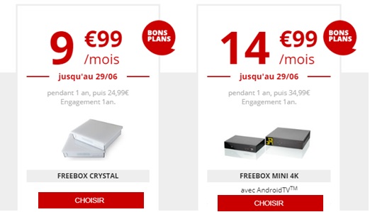 Cet opérateur internet propose également actuellement d'autres bons plans Freebox directement sur le site Free.fr. Jusqu’au 29 juin prochain, l'offre Freebox Crystal est affichée à 9.99€ par mois pendant un an puis 24.99€ (engagement un an). Cet abonnement box pas cher comprend un accès Internet ADSL2+, le téléphone avec les appels illimités vers les fixes de plus de 110 destinations. Autre offre disponible en promo, la Freebox Mini 4K avec Android TV affichée sur le site free.fr à 14.99€ par mois pendant 12 mois puis 34.99€ (engagement 12 mois). Cette formule regroupe un accès Internet fibre optique jusqu’à 1Gb/s (existe aussi en ADSL2+ et VDSL2+), le téléphone avec les appels illimités vers les fixes de plus de 110 destinations. Et enfin, pour la partie TV, cette offre embarque plus de 220 chaînes avec la Freebox TV (compatible 4K) et le Freebox Replay.