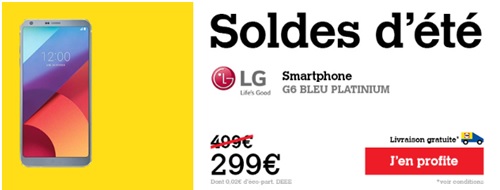 Les soldes d'été 2018 démarrent aujourd'hui, l'occasion pour vous de réaliser de belles affaires pour l'achat d'un nouveau Smartphone. Le site Darty propose de nombreux bons plans sur plusieurs références notamment le LG G6. Ce modèle du constructeur Coréen profite en effet d'une remise immédiate de 200€, le LG G6 est ainsi proposé au prix de 299€ au lieu de 499€. Ce Smartphone haut de gamme lancé en Avril 2017 est disponible en Bleu Platinium chez ce marchand.