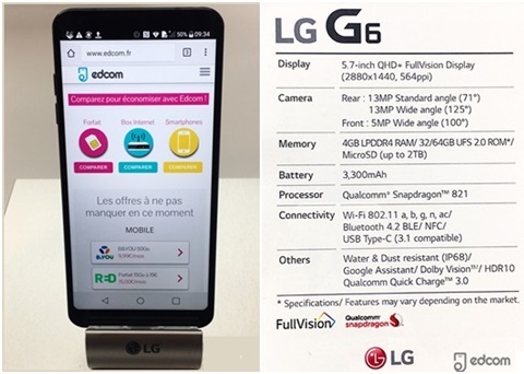 Le LG G6 est doté d'une coque 100% métal. Son écran « borderless » recouvre 80% de la surface de l’appareil. La diagonale de ce téléphone est de 5,7 pouces avec une dalle QHD, une résolution de 2880 x 1440 pixels et enfin une définition de 564 ppp. Ce LG offre un affichage au format 18:9. Certifié IP68, le LG G6 résiste à l'eau et à la poussière. La batterie de 3300mAh offre une autonomie de 12 heures pour un usage internet. Sous le capot du LG G6, se loge un processeur Snapdragon 821 accompagné par 4 Go de RAM. Il est livré avec la version Android 7.0 Nougat.