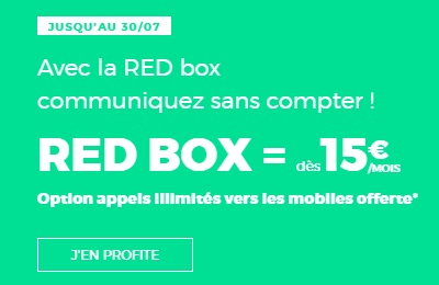 L'opérateur RED BY SFR vous permet de vous équiper d'une BOX à petit prix sans engagement et sans condition de durée. Les offres BOX de l'opérateur démarrent à 15€ par mois par ADSL ou encore 20€ en THD ou par la Fibre. Et jusqu'au 30 juillet, RED by SFR vous permet de profiter des appels illimités vers les mobiles en France. L'option habituellement facturée 5€ par mois est en effet offerte. Les abonnements Internet de l'opérateur RED à prix réduit sont disponibles sous réserve d'éligibilité technique. En zone non dégroupée, il faudra ajouter 5€ de plus par mois. Les frais d’ouverture de service sont de 49€ et les frais de résiliation de 49€. La Box obligatoire est mise à disposition gratuitement.