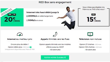Autre formule avec un accès Internet plus rapide, la RED BOX à 20€ par mois en THD ou Fibre. Pour cet abonnement, l'opérateur utilise différentes technologies THD, Fibre avec terminaison coaxial ou encore Fibre optique (FTTH). Sous réserve d'éligibilité technique, RED vous permet ainsi de bénéficier d'une connexion avec un débit descendant théorique jusqu’à 1 Gb/s (avec booster de débit en option à 5€ par mois ou jusqu'à 200Mb/s sans option). Cet abonnement comprend aussi le téléphone illimité vers les fixes en France et vers plus de 100 destinations internationales. Les appels illimités vers les mobiles sont aussi inclus sans aucun surcoût avec cette formule et ce jusqu'au 30 juillet.